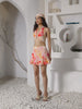 The wrap-style halter top creates a sculpted yet fluid neckline, beautifully highlighting the shoulders and waist. Paired with a high-rise mini skirt, the silhouette feels light, feminine, and effortless to move in. Finished in a soft floral print, the look feels romantic, polished, and perfect for sun-soaked days and elegant evenings.
